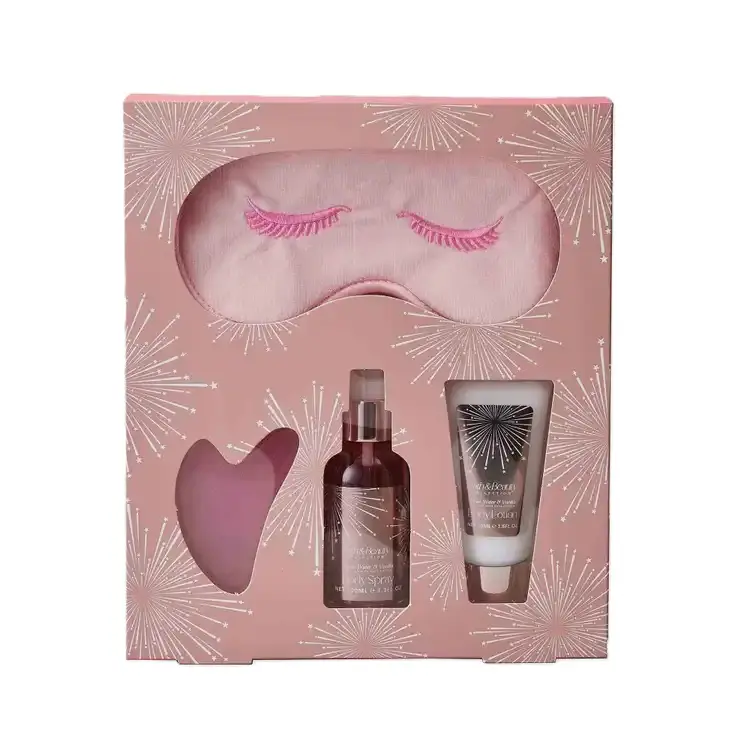 Set includes: eye mask, body spray, body lotion and skin smoothing tool