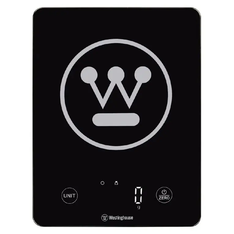 Westinghouse Kitchen Scale with a smart tempered glass surface. It also features an LCD display, touch sensor control panel, high precision sensors, auto-off and overload or low battery indicator function