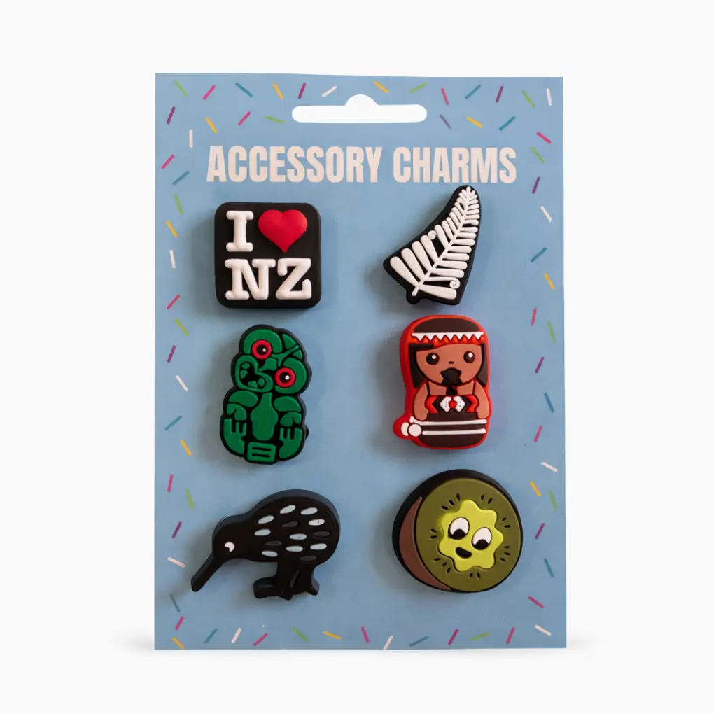 Add a touch of Aotearoa to your footwear with these Maori Croc Accessory Charms, featuring iconic New Zealand designs including a tiki, silver fern, kiwi, koru-inspired character, kiwi fruit, and an NZ badge.