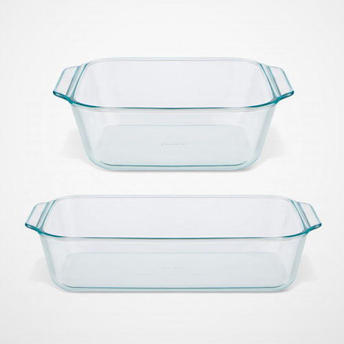 Set includes a Deep Glass Baking Dish 2.5L. 20.3cm x 20.3cm x 6.8cm and a Deep Glass Baking Dish 4.7L. 22.8cm x 33cm x 7.6cm.